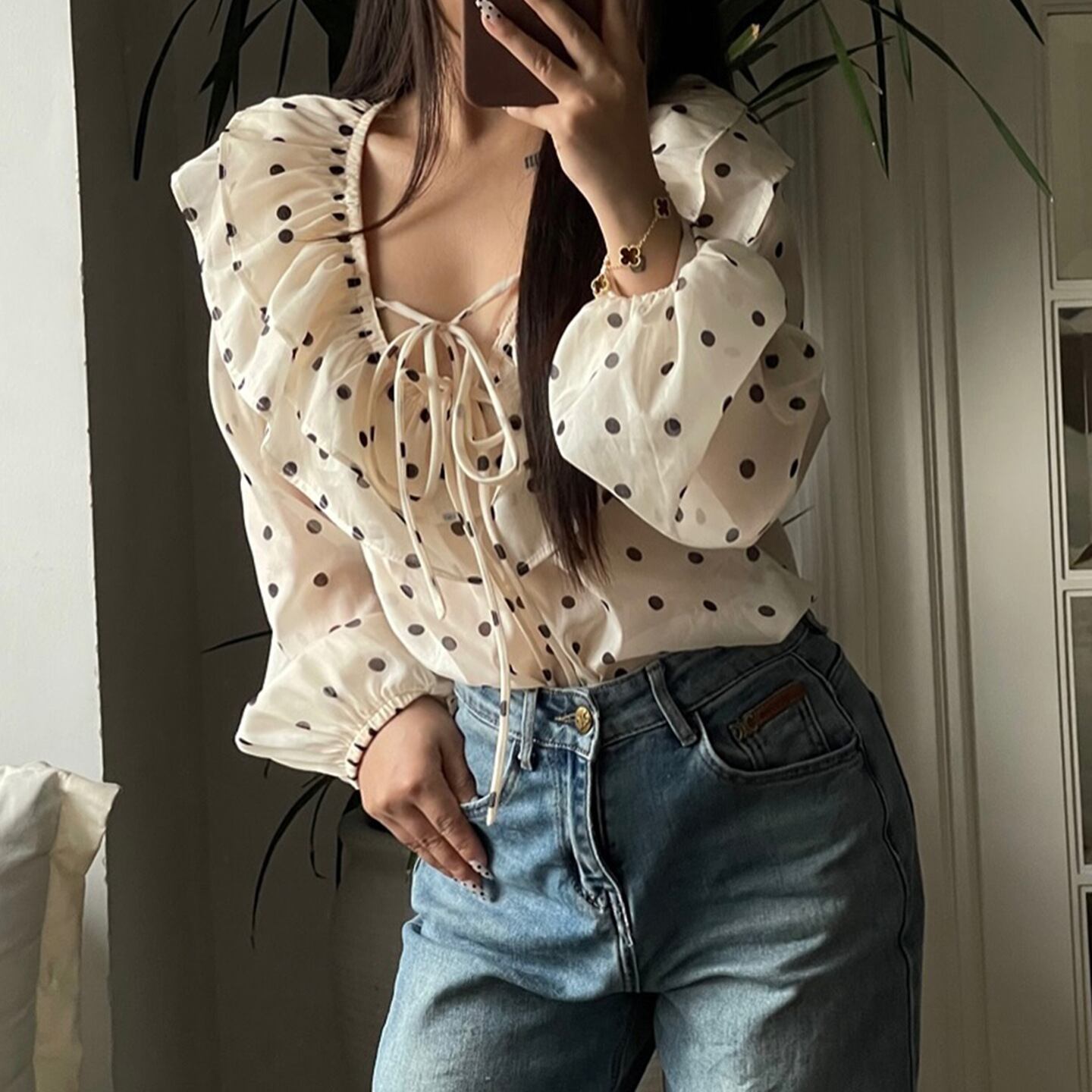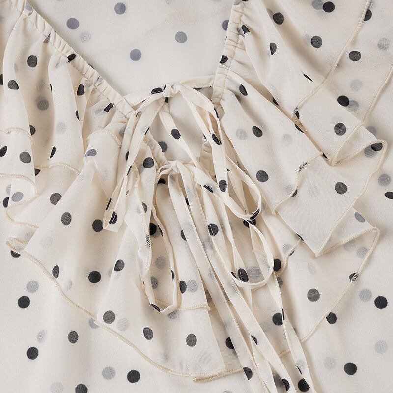 透け感のあるシフォン素材に、クラシカルなドット柄を散りばめたフリルブラウス。