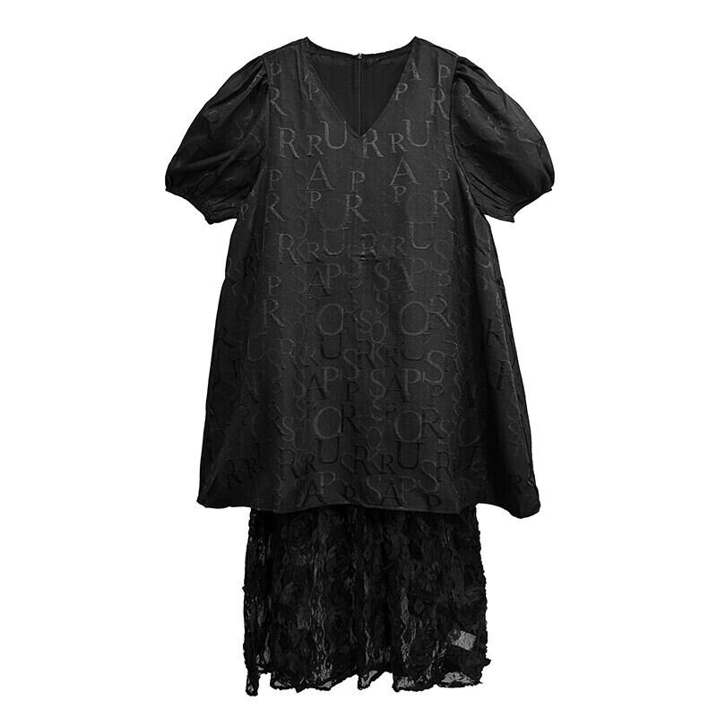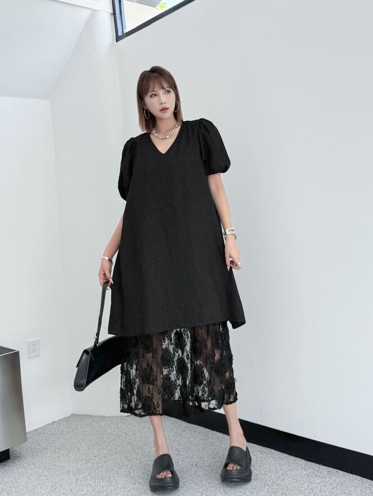 ふんわりシルエットのブラックワンピースに、繊細なフラワーレースを重ねた大人モードな一着。