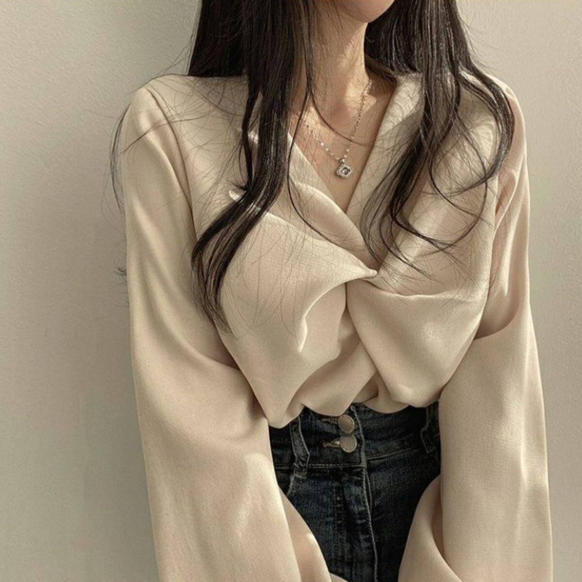 胸元のツイストデザインが女性らしさを引き立てるカシュクールトップス。